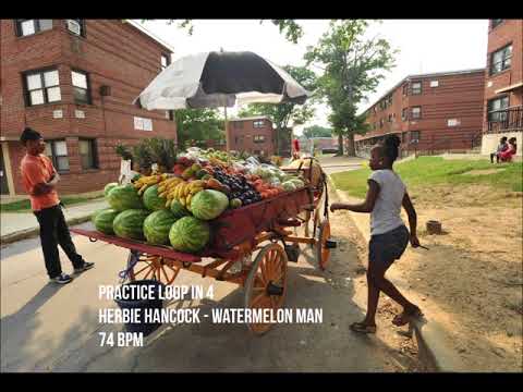 This is a practice loop I use a lot, sampled from the intro of Herbie Hancock's Watermelon Man, from the album Headhunters. At 74 bpm it's a little faster than one of my other favorites, If I'm In Luck... by Betty Davis. There are some interesting cross rhythms happening, so you have to pay attention to how you place your notes. This is great for working on any of my cut time funk stuff.